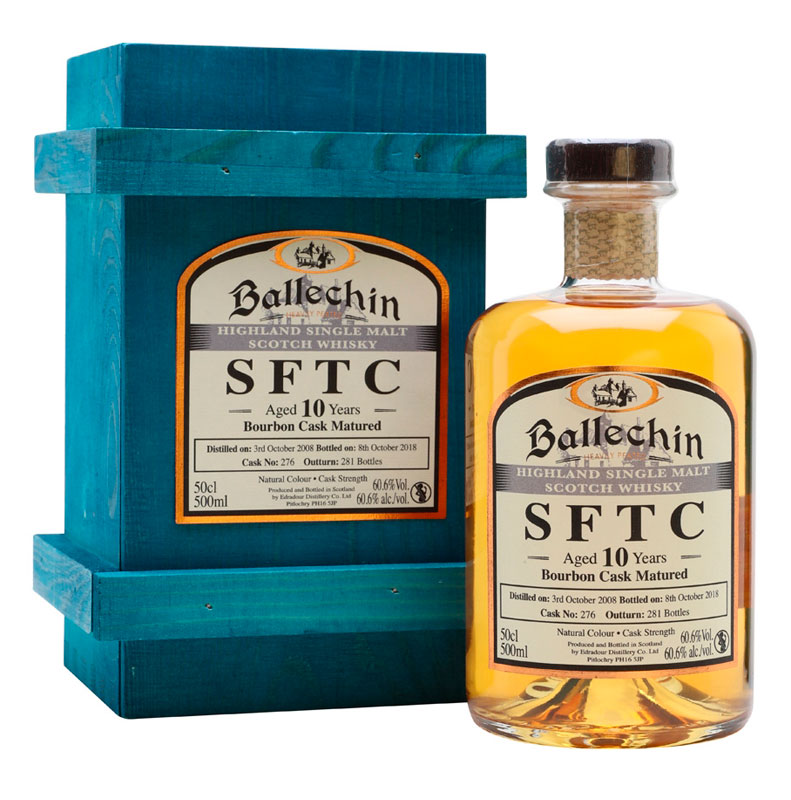 Un Ballechin de 10 años de edad, de la destilería Edradour, envejecido en un solo barril de bourbon y embotellado en 2018 para la serie Straight from the Cask de la destilería. La nariz es fresca y herbal, con aromas de hierba fresca y chocolate que se acumulan lentamente. El paladar proporciona notas de roble, miel y más chocolate, con un fuerte humo de turba, antes de convertirse en un final persistente de canela y hierbas frescas.