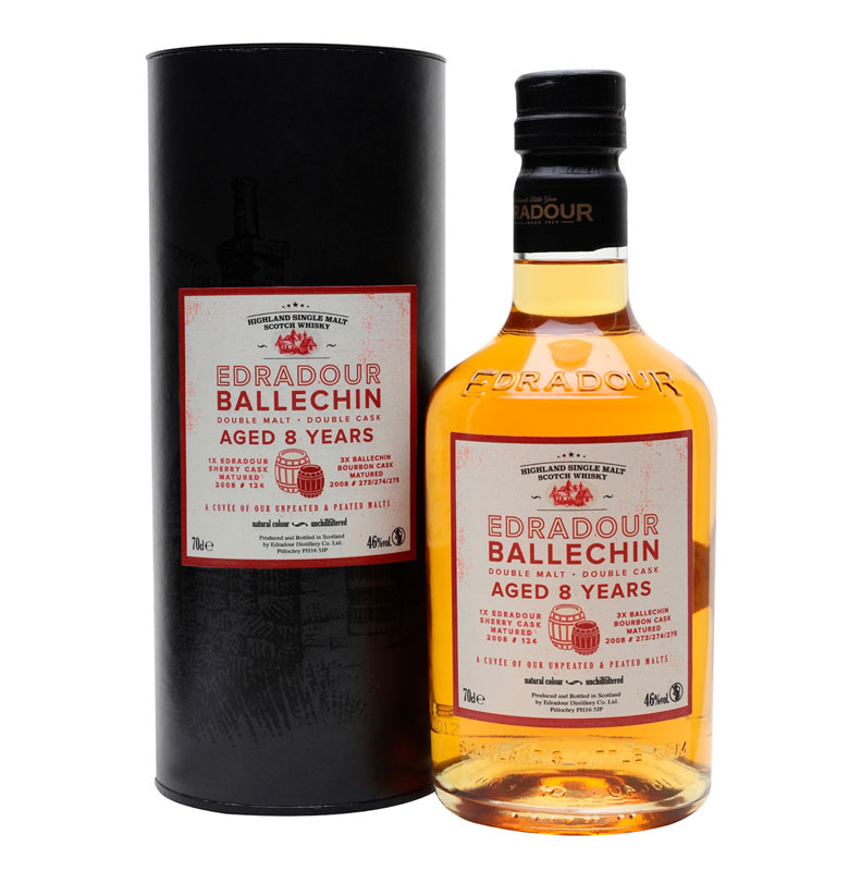 ¿Cómo hacer un whisky ligeramente ahumado en Edradour? Combina un barril de jerez de Edradour sin turba con tres barriles de Ballechin madurado en bourbon muy turbados. Envejecido durante ocho años, este tiene notas de chocolate negro, praliné y humo