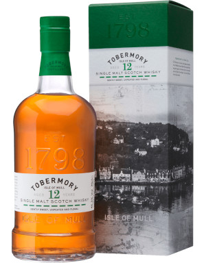 Tobermory 12 años ofrece potentes notas de frutas y especias con un sutil sabor salado que refleja las aguas del puerto en Tobermory.